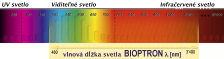 Svetlo BIOPTRON je polychromatické (viacfarebné) svetlo. To znamená, že obsahuje nielen jednu vlnovú dĺžku (ako laserové svetlo), ale širokú škálu viditeľného svetla a časť infračerveného spektra. Rozsah vlnovej dĺžky svetla BIOPTRON je od 480 nm do 3 400 nm.